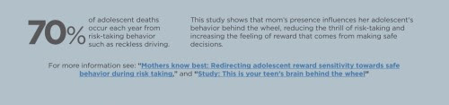 “When they make safe decisions, when they choose to stop instead of going through that intersection, the prefrontal cortex comes online,” she said. “It’s activated when mom is there, but not when they’re alone.” (See graphic.)